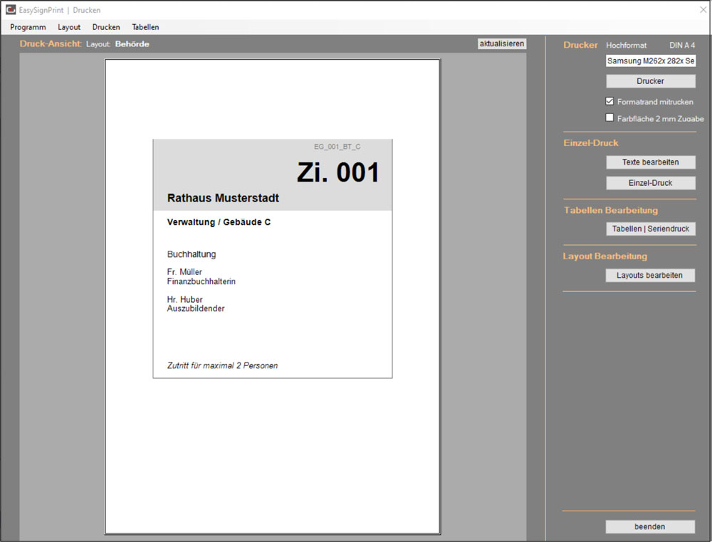 EasySignPrint, Easy Sign Print, Easy-Sign-Print, Türschild, Türschilder, Türschilder drucken, Einleger drucken, Türschilder beschriften, Raumschilder drucken, Raumschilder beschriften, Raumschild, Raumschilder, Orientierungssystem, Orientierungssysteme, Orientierungssysteme beschriften, Seriendruck Einleger, Seriendruck Türschilder, Seriendruck Raumschilder, swt-edv, Softwareentwicklung, Software, Programm, Programmierung, Datenbankprogrammierung, Datenbank, Deutschland, Bayern, Regensburg,