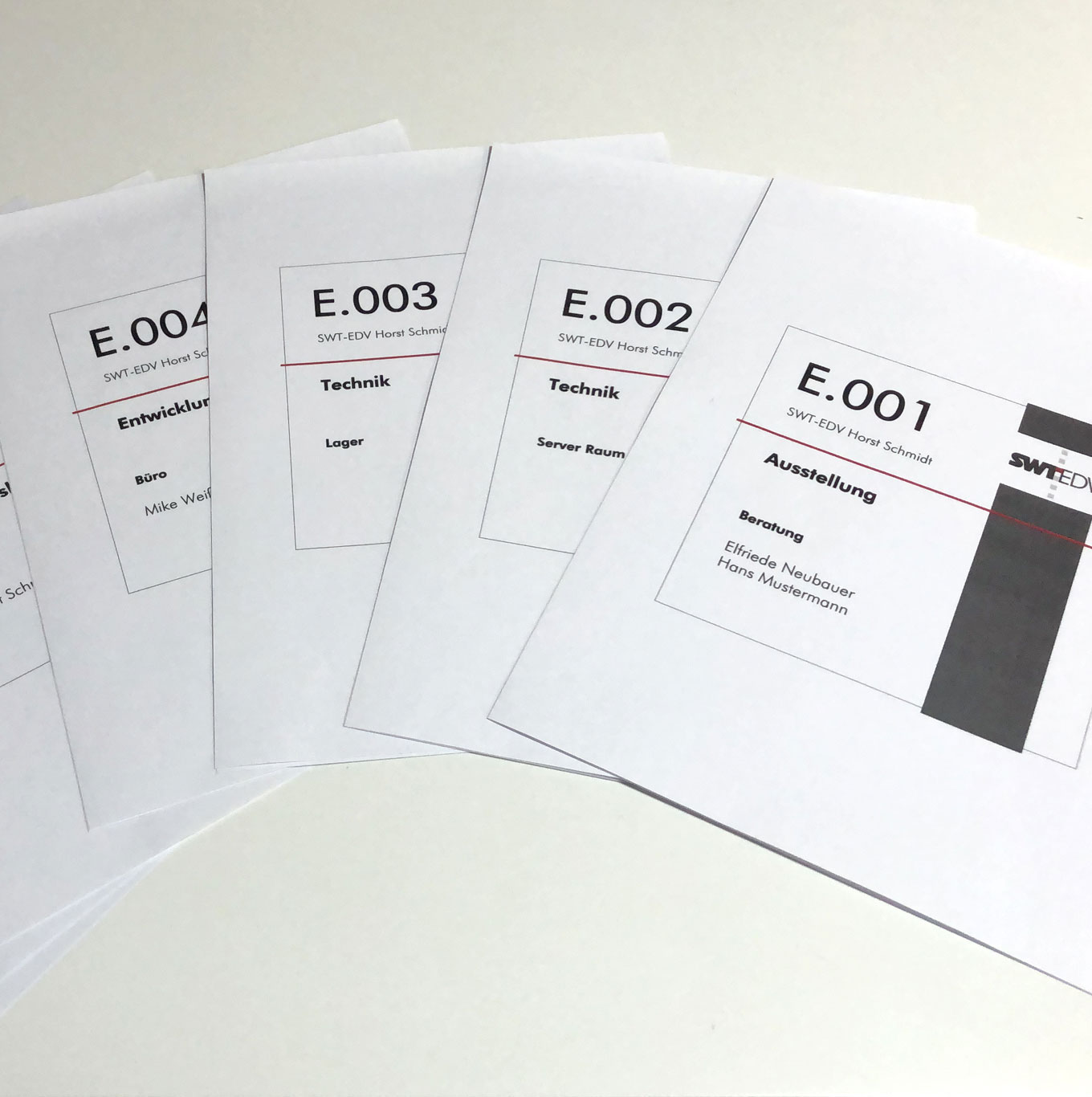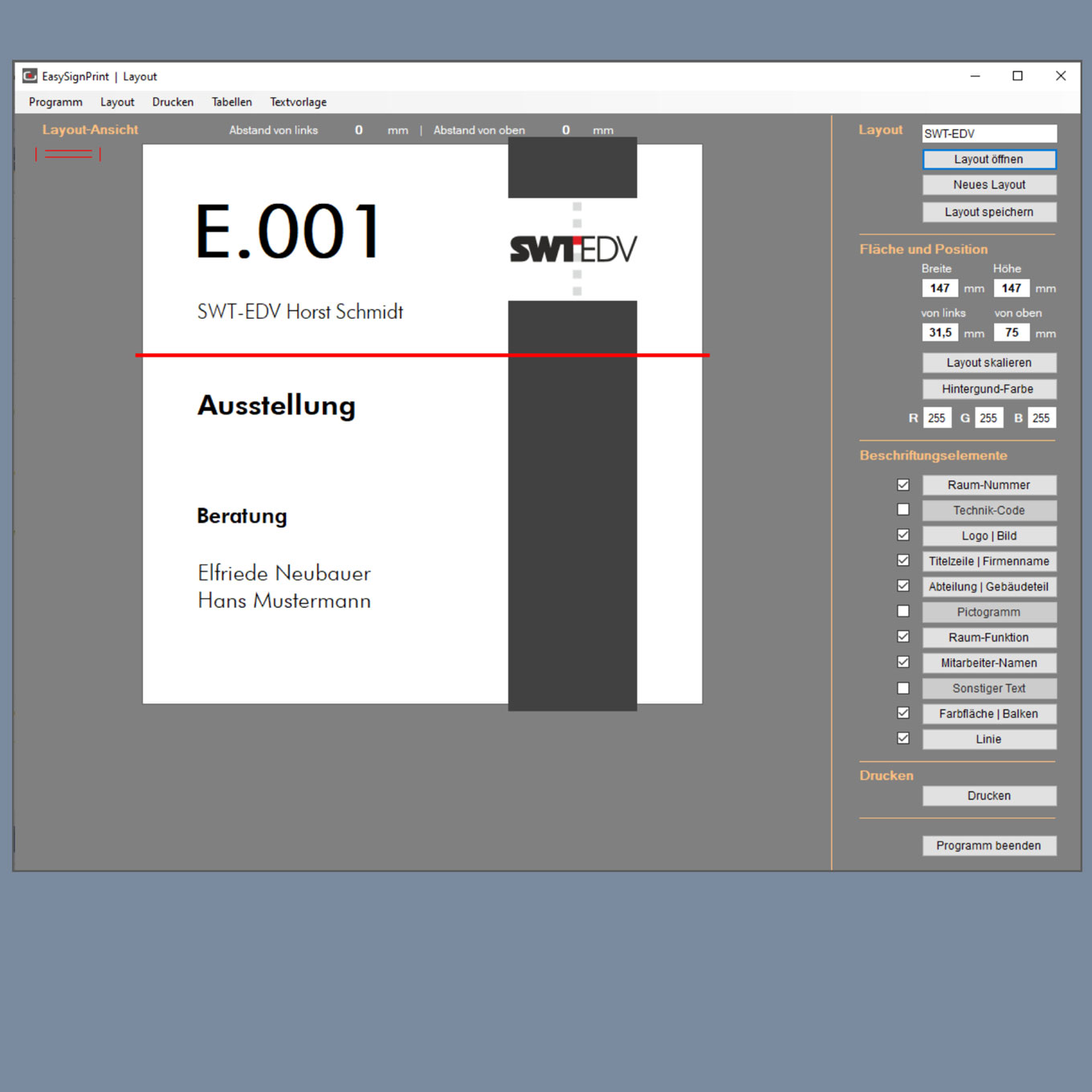 EasySignPrint ist ein Programm zum rationellen erstellen und drucken von Türschild-Einlegern. * Verwendung vorgegebener Standard-Layouts oder Erstellung individueller eigener Layouts * Druckvorschau zur genauen Kontrolle * Einzel- oder Seriendruck (aus Tabellen) * Importieren, bearbeiten und ergänzen von Tabellen Generieren neuer Tabellen |