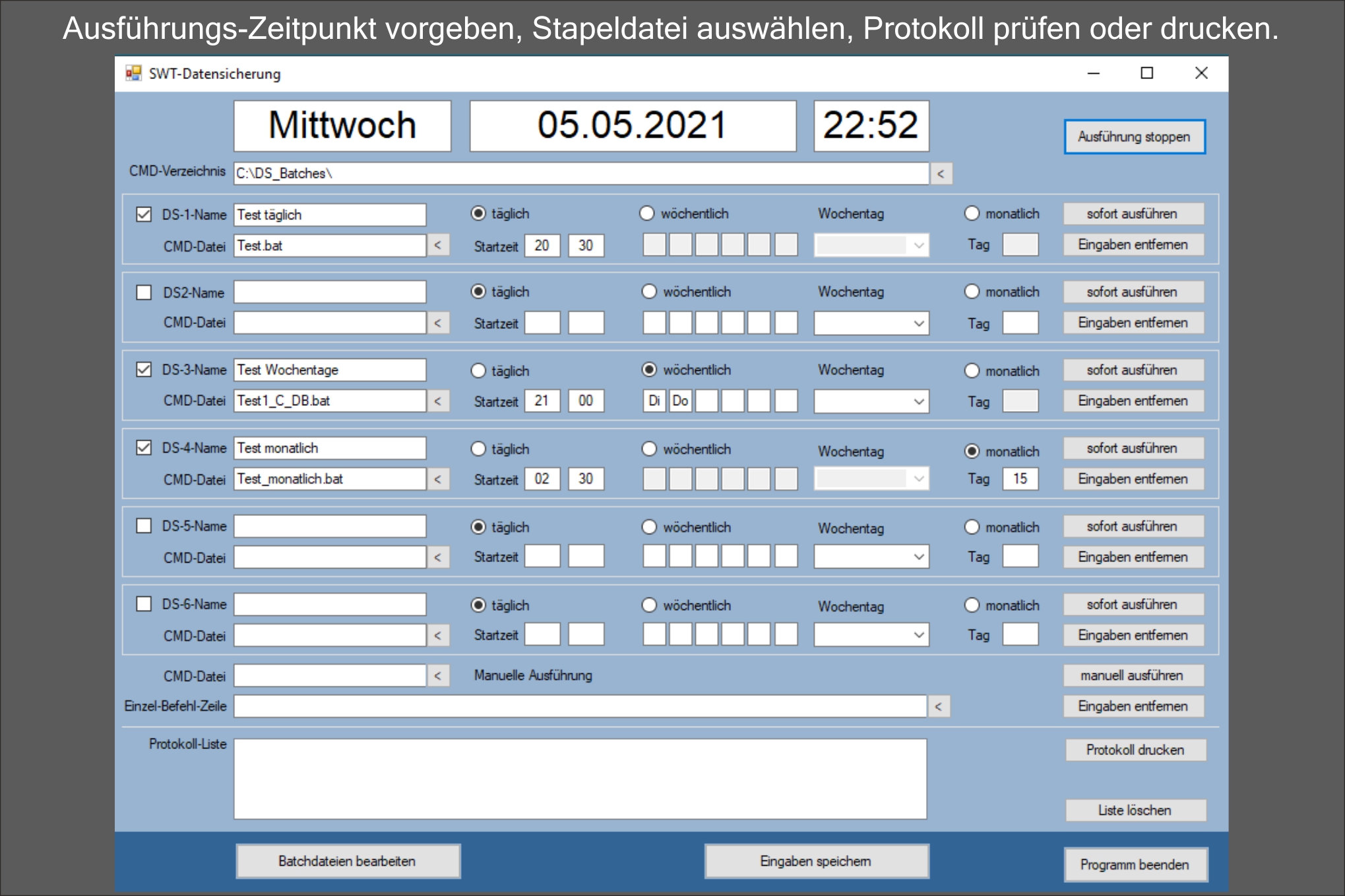 * Starten der Datensicherung zu bestimmten Tagen an unterschiedliche Destinationen senden. * Täglich zu bestimmten Zeiten Daten vom Home- Office an einen Server übermitteln. * Kontrolle durch ein fortlaufendes Protokoll. Sollte ein Fehler aufgetreten sein, kann die betreffende Stapelverarbeitung sofort manuell nochmal gestartet werden. * In Planung: Generator für Stapeldateien. Auch ohne Vorkenntnisse Abläufe am PC steuern und automatisieren. |